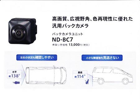 多彩な技術を搭載し、コストパフォーマンスにも優れたバックカメラ「ND-BC7」。カロッツェリアカーナビをはじめ、RCA映像入力端子付のカーナビやカーAV、様々なモニターと組合わせて使用できます。