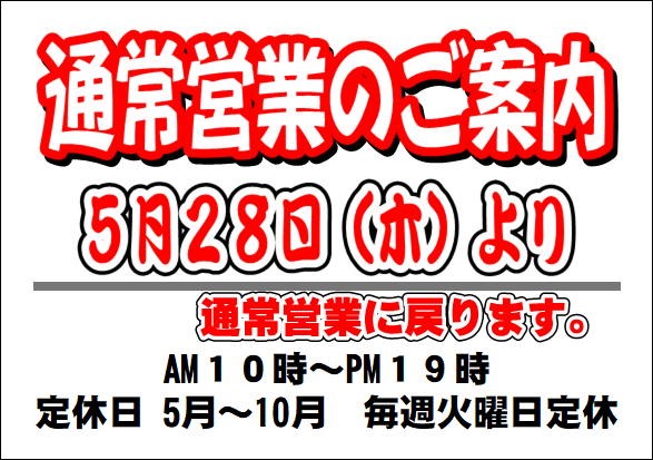 当店では、緊急事態宣言での外出自粛要請等に従い、店舗の時短営業の措置をしていましたが、5月25日に首都圏・北海道を含めた緊急事態宣言の全面解除が政府より発表されたことを受け、感染拡大防止に向けた対策を継続的に実施した上で、5月28日(木)より通常営業に戻させて頂きます。