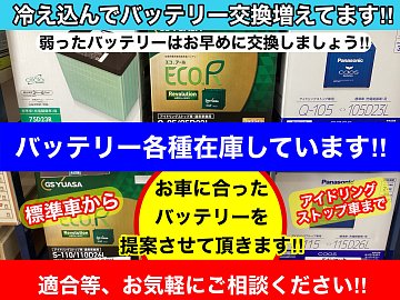 こんにちは‼︎ 『タイヤ館 平岡』です‼︎ 雪降りましたネ・・・冷え込む日が続きますネ・・・さて 皆様のお車のバッテリー、調子いかがでしょうか? 急にやってくるバッテリートラブルを防ぐ為には お早めの交換をオススメします‼︎ 『タイヤ館 平岡』では 各種バッテリーをご用意しております‼︎ バッ...