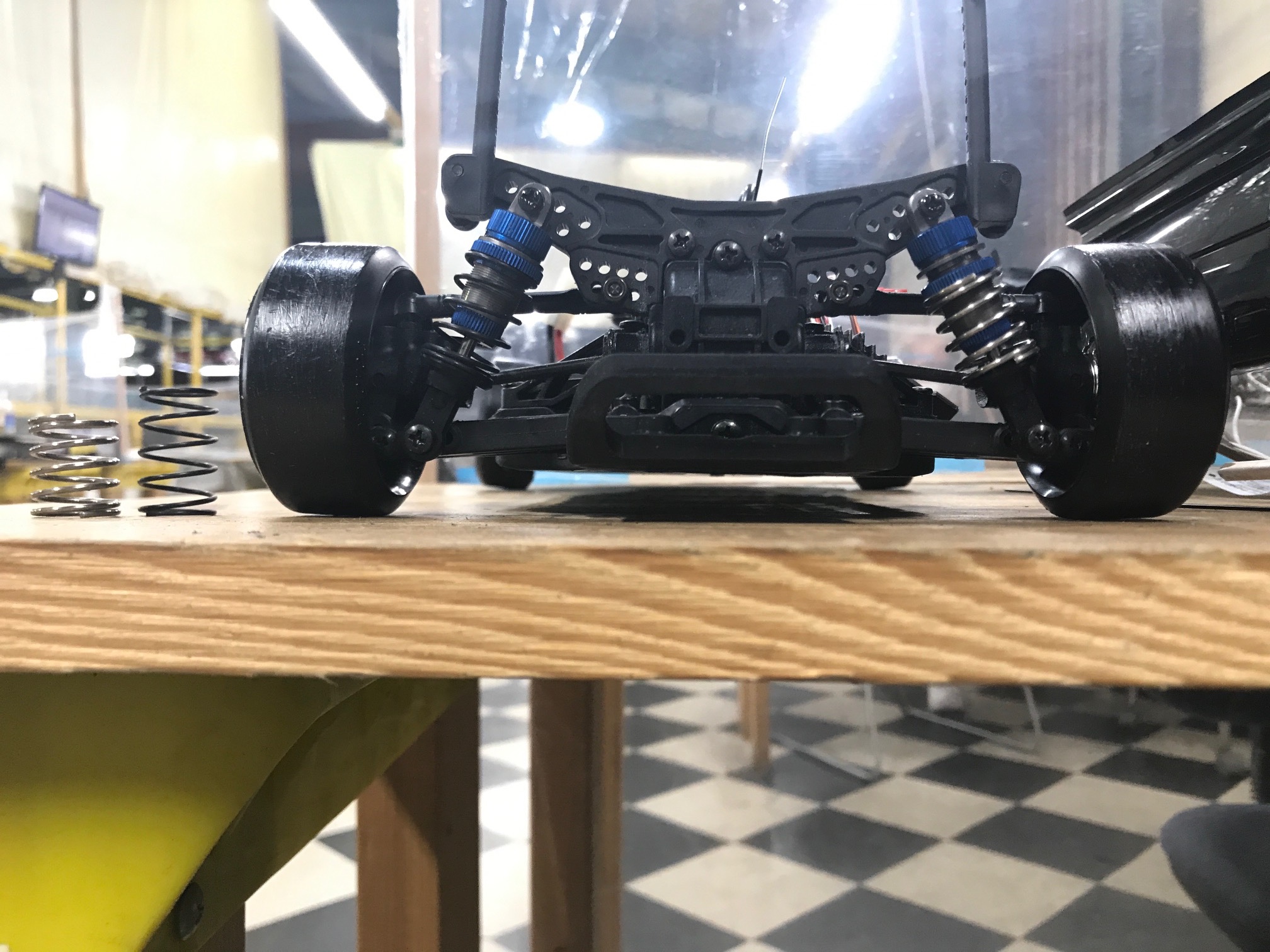 写真3: 走っては調整、トライ&エラーを繰り返し車高7mmとバネの組み合わせ変更に落ち着きました。