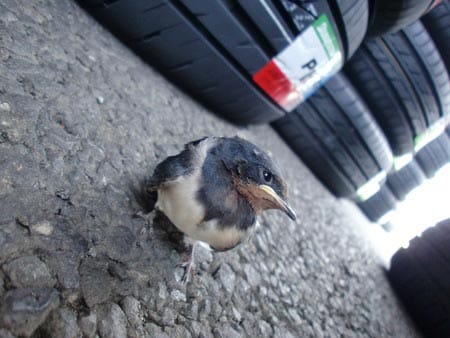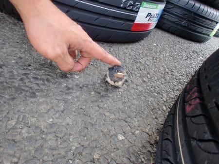 アスファルトの上に置き、少し離れた所から見守っていると、親鳥の飛ぶ姿の真似をして無事(?)飛び立っていきました!