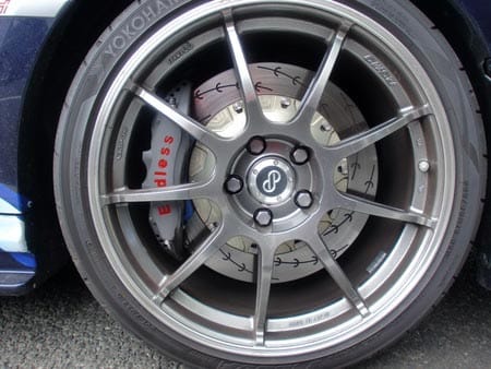 もちろんブレーキメーカーの車なので、高いブレーキキャリパー付いてるんだろうな~と思って近寄ってみると。。。アレ?エンドレスのブルーメタリックのキャリパーじゃない?!