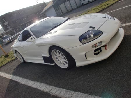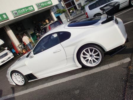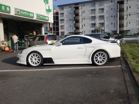 タモンデザインのワイドフェンダー、トップシークレットのバンパーの付いたJZA80スープラに