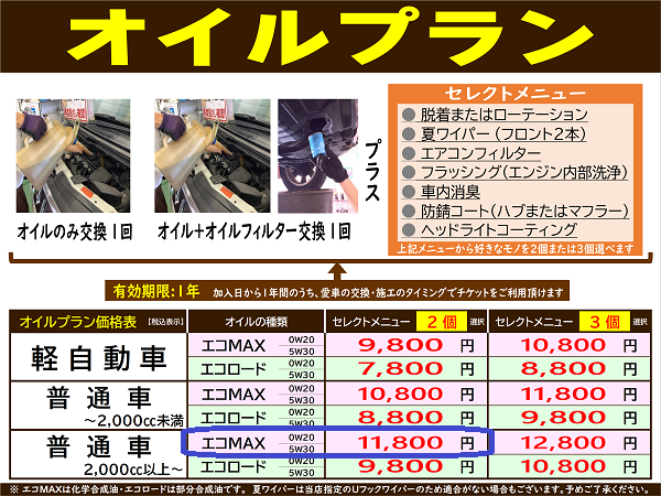 オイルは化学合成油のエコMAXにしましたので価格は11,800円(税込)です。