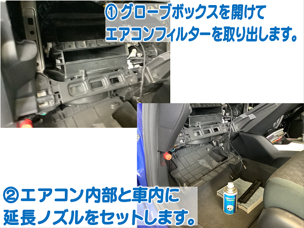 ①グローブボックスを開けてエアコンフィルターを取り出します。