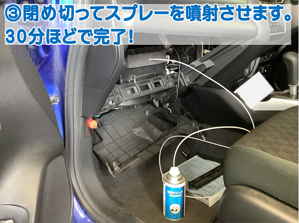 ③車内全体にいきわたるように閉め切ってスプレーを噴射させます。