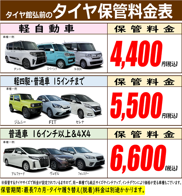 保管料金はコチラ↓↓ ※タイヤの履き替え(脱着)料金は別途かかります。
