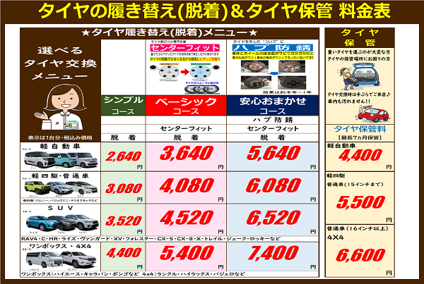 タイヤ館弘前のタイヤ履き替え(脱着)メニューはコチラです↓↓