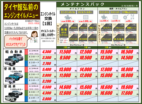 エンジンオイル単品での交換はもちろん、お得なメンテナンスパックもございます。