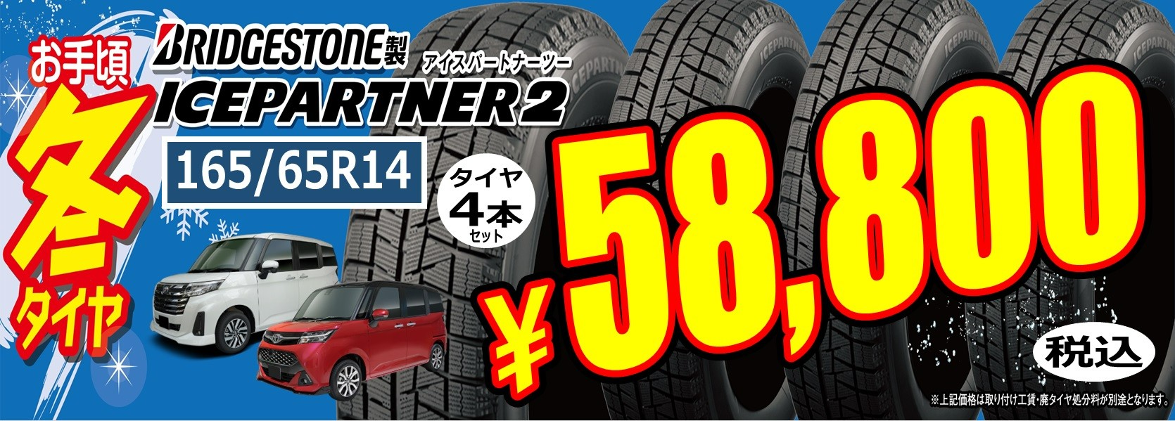 軽自動車からコンパクトSUVサイズのブリヂストンタイヤ専門店のみ取り扱い、お手頃タイヤの《アイスパートナー2》の取り扱いもございます‼