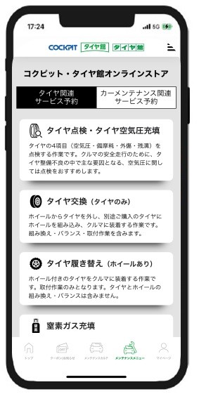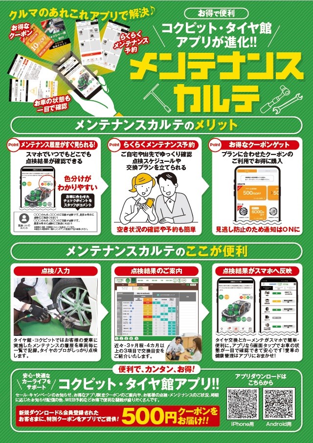 コクピット・タイヤ館アプリがよりお得で便利に進化「メンテナンスカルテ」