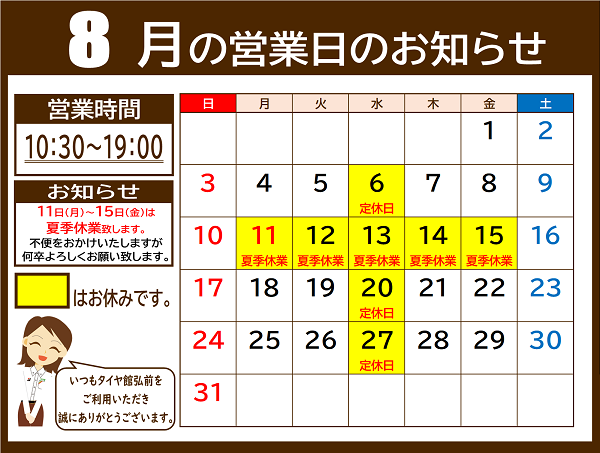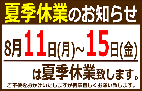 8月は毎週水曜日の他に、11日~15日まで夏季休業となります。