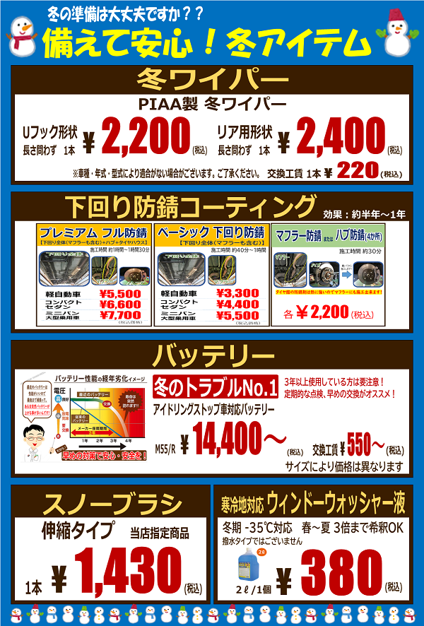 冬ワイパー・下回り防錆・スノーブラシなど冬アイテム取扱いしてます!