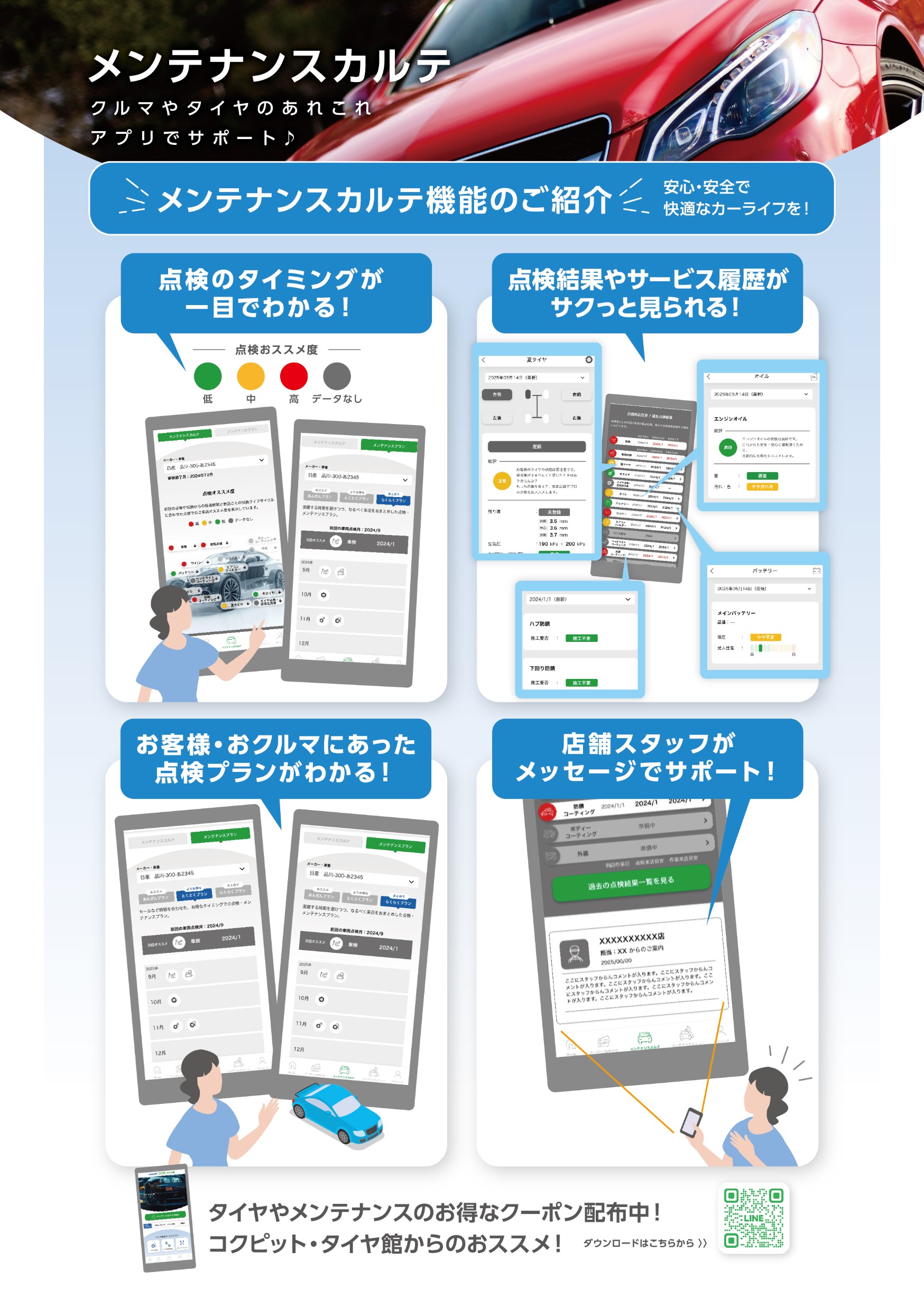 【全車点検実施中】安全サポート宣言 ポスト 2025年11月14日 いつも当店をご利用いただきありがとうございます 当店では冬のカーライフの安全安心をサポートするために全車安全点検実施「安全サポート宣言」を実施中! タイヤ・ライト周り・オイル・バッテリー・ワイパーなど基本かつ重要な部分はもちろん、 下回りのサビなどクルマ長持ちに関する項目も無料点検いたします! コクピット・タイヤ館アプリがあれば点検結果や次回来店目安をいつでも確認できます! お得なクーポンや情報も発信中!ご予約もアプリで簡単!ぜひダウンロードしてくださいね!