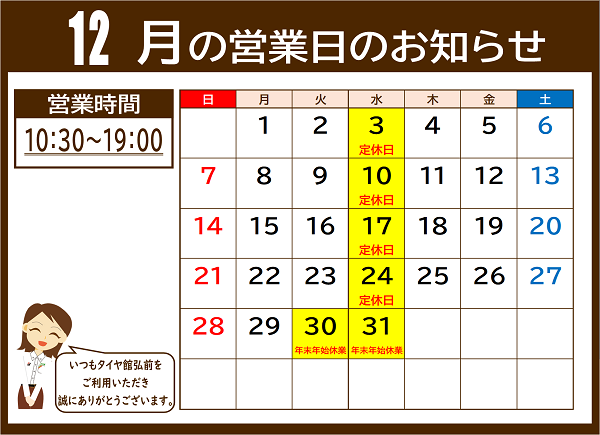 12月のお知らせ ポスト 2025年12月1日 タイヤ館弘前のホームページをご覧いただき誠にありがとうございます。 今日から営業時間が10時30分~19時の通常営業となります! また、毎週水曜日は定休日に戻ります。 年末年始休業は12月30日~1月4日となります。 タイヤの点検や購入、オイル交換などは早めのご来店をオススメ致します。 ご不便をおかけいたしますが、何卒よろしくお願い致します。 セール情報等は随時発信いたします! 今月もタイヤ館弘前をよろしくお願い致します(*'▽')♪