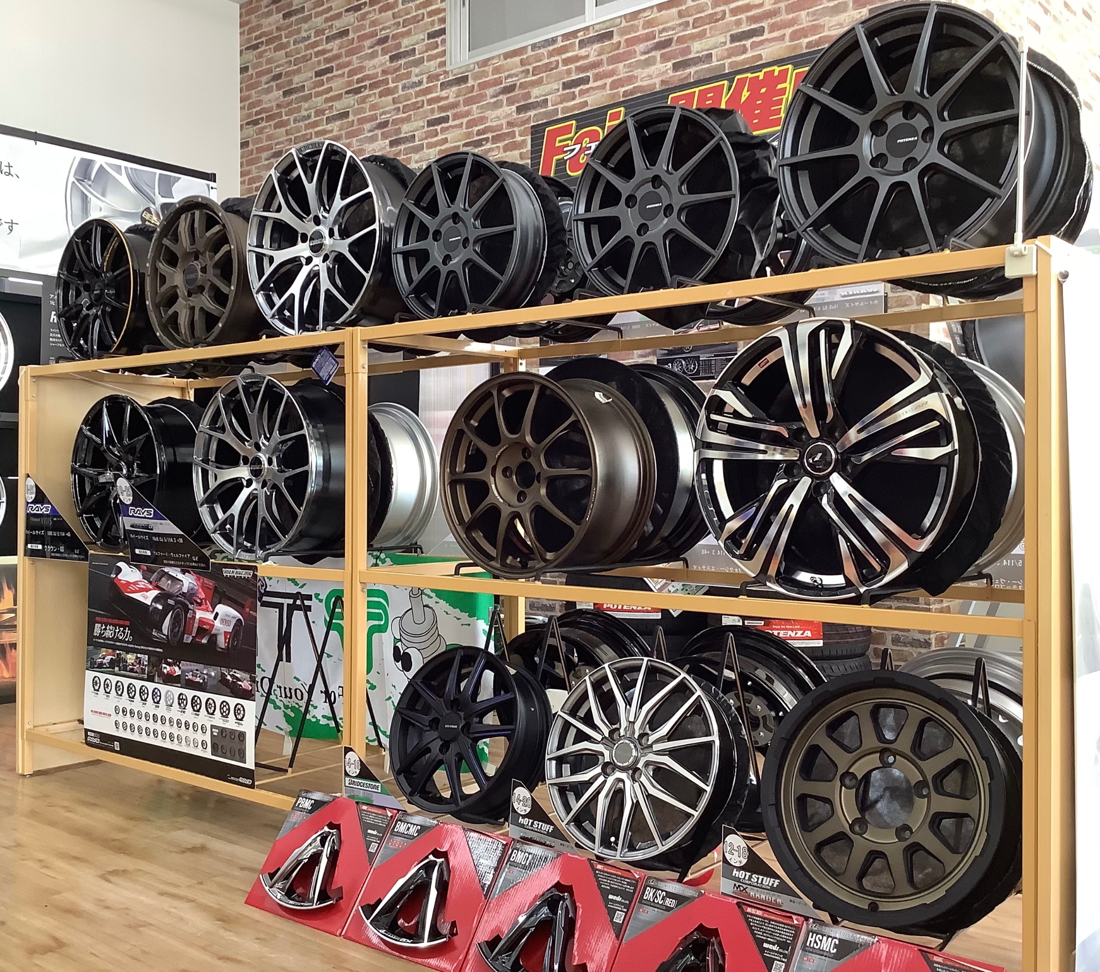 各ホイールメーカーのアルミホイールを多数展示しています