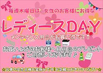 明日、木曜日は毎週・・レディースDayです!オイル交換やメンテナンス用品がお買い得に買えるチャンスです!