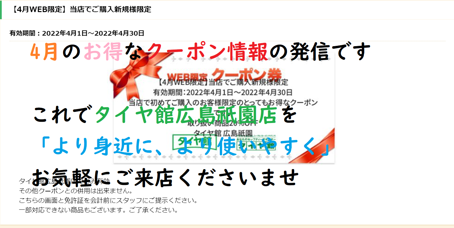 セール・クーポン情報 | タイヤ館 広島祇園 | タイヤからはじまる、トータルカーメンテナンス タイヤ館グループ (taiyakan.co.jp)