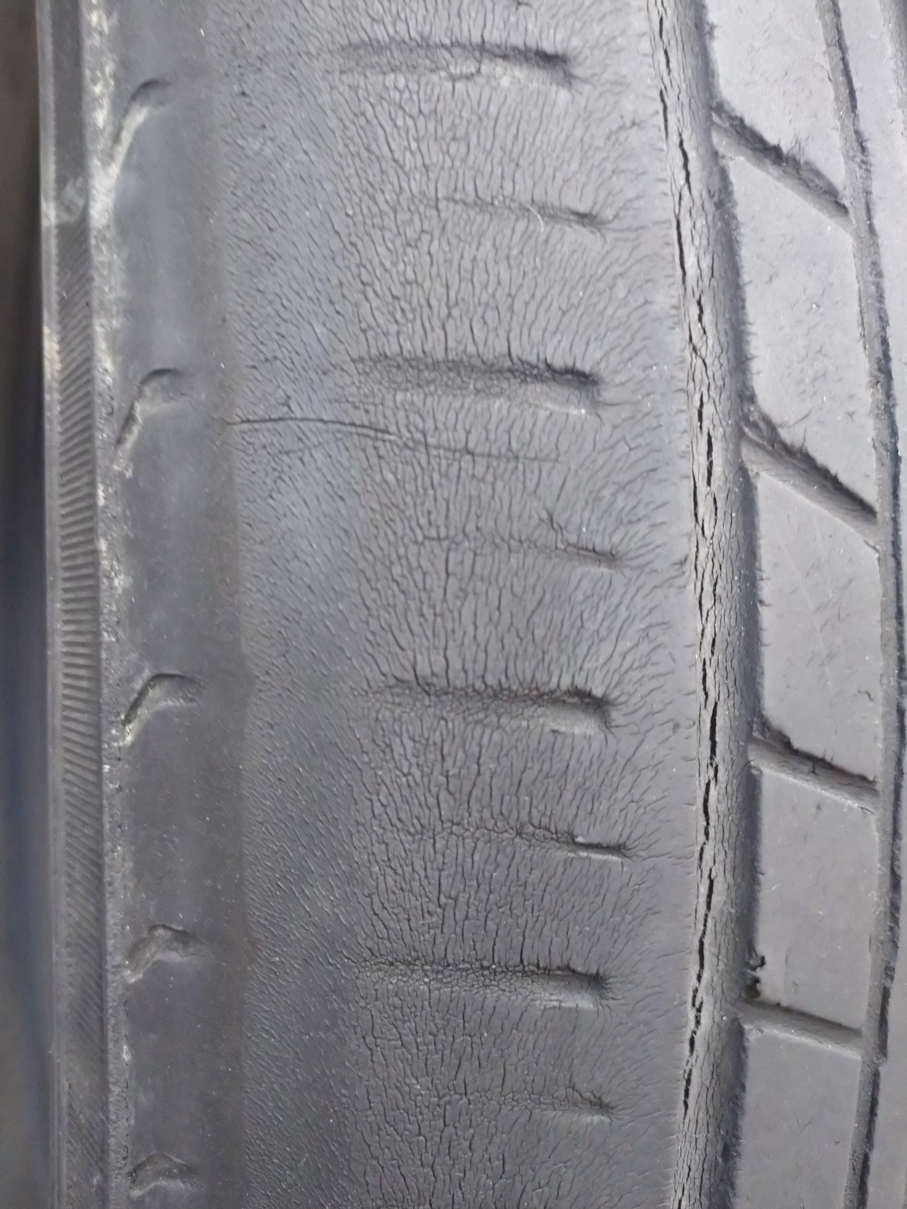 溝が少なく、ひび割れも起きているタイヤの写真ですが、タイヤがすり減り、写真のような状態になると、雨の日に滑りやすくなり、非常な危険です!