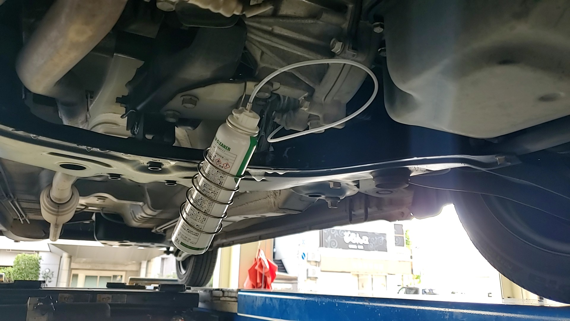 エアコンの排水チューブに管を通しエバポレーターに洗浄液を噴射します。