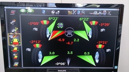 測定結果は案の定、特に強打されたという左フロントのトゥがかなりアウトに向いてました。