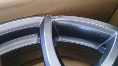 ホイール2本ともキズが入り、うち1本は割れも見え、
