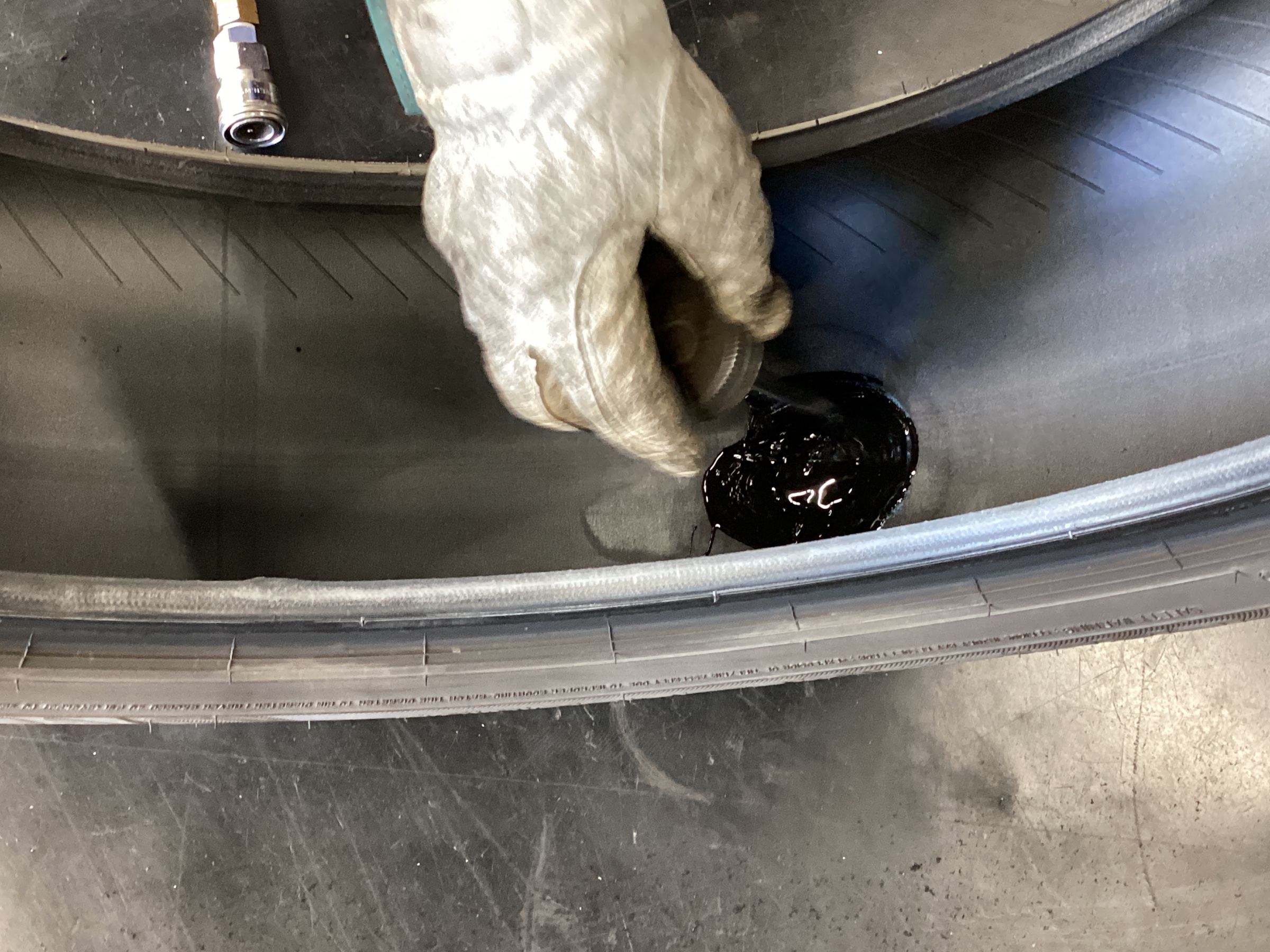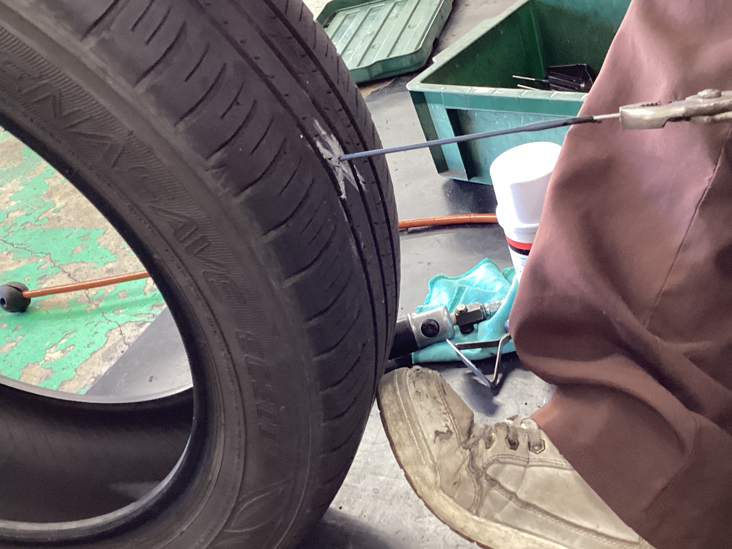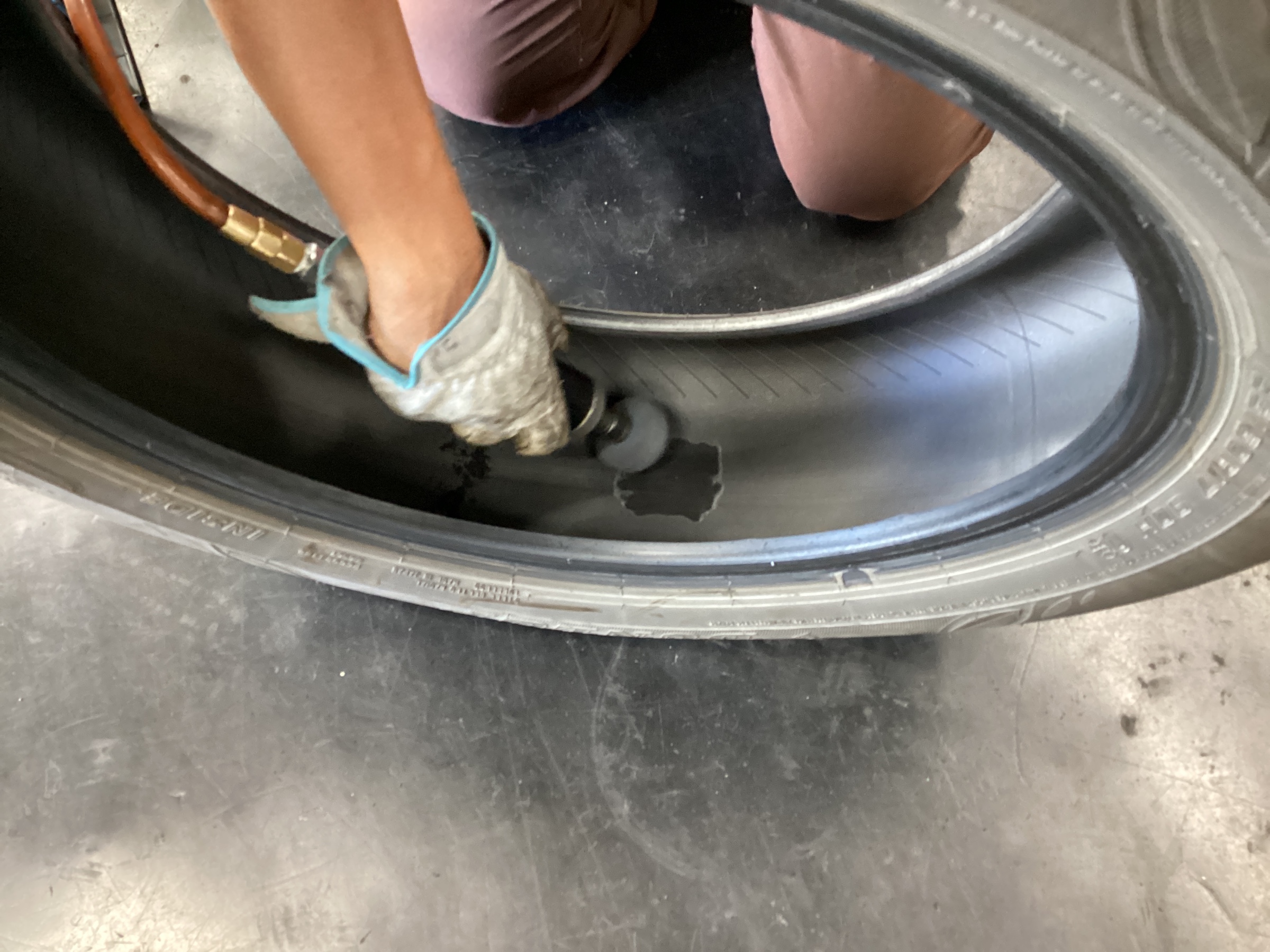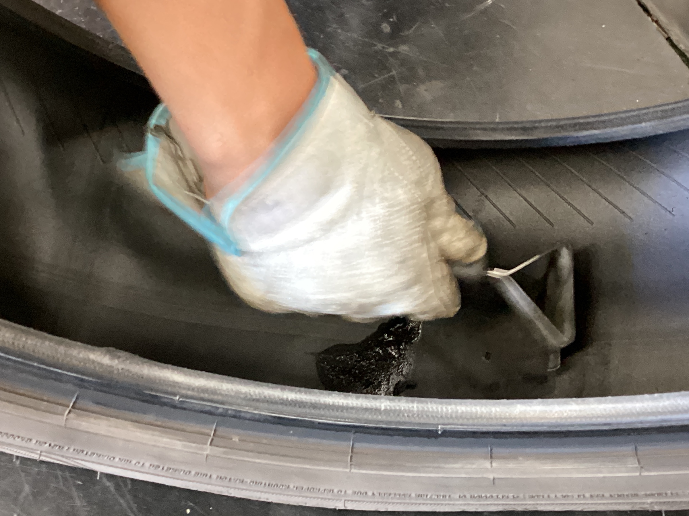 修理剤を張り付けるためにインナーライナーという、空気を抜けにくくするための層を削っていきます。