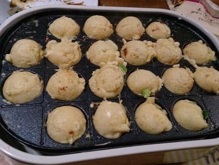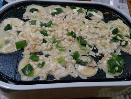 粉・卵を水で溶き、たこ焼き器に流し。