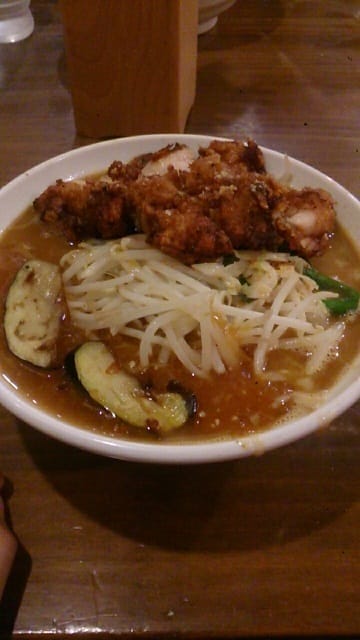 味噌ベースのとろみのあるスープに、上には300gの唐揚げが鎮座。