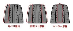 タイヤを新品に交換されたときに それまで履いていたタイヤが「偏摩耗」しているとご指摘を受けたことはありませんか? タイヤのもったいない減り方、つまり「偏摩耗」という言葉は聞いたことがあるけれど、 どんなふうに減るの?という方もいらっしゃると思います。 「偏摩耗」とは、タイヤのトレ...