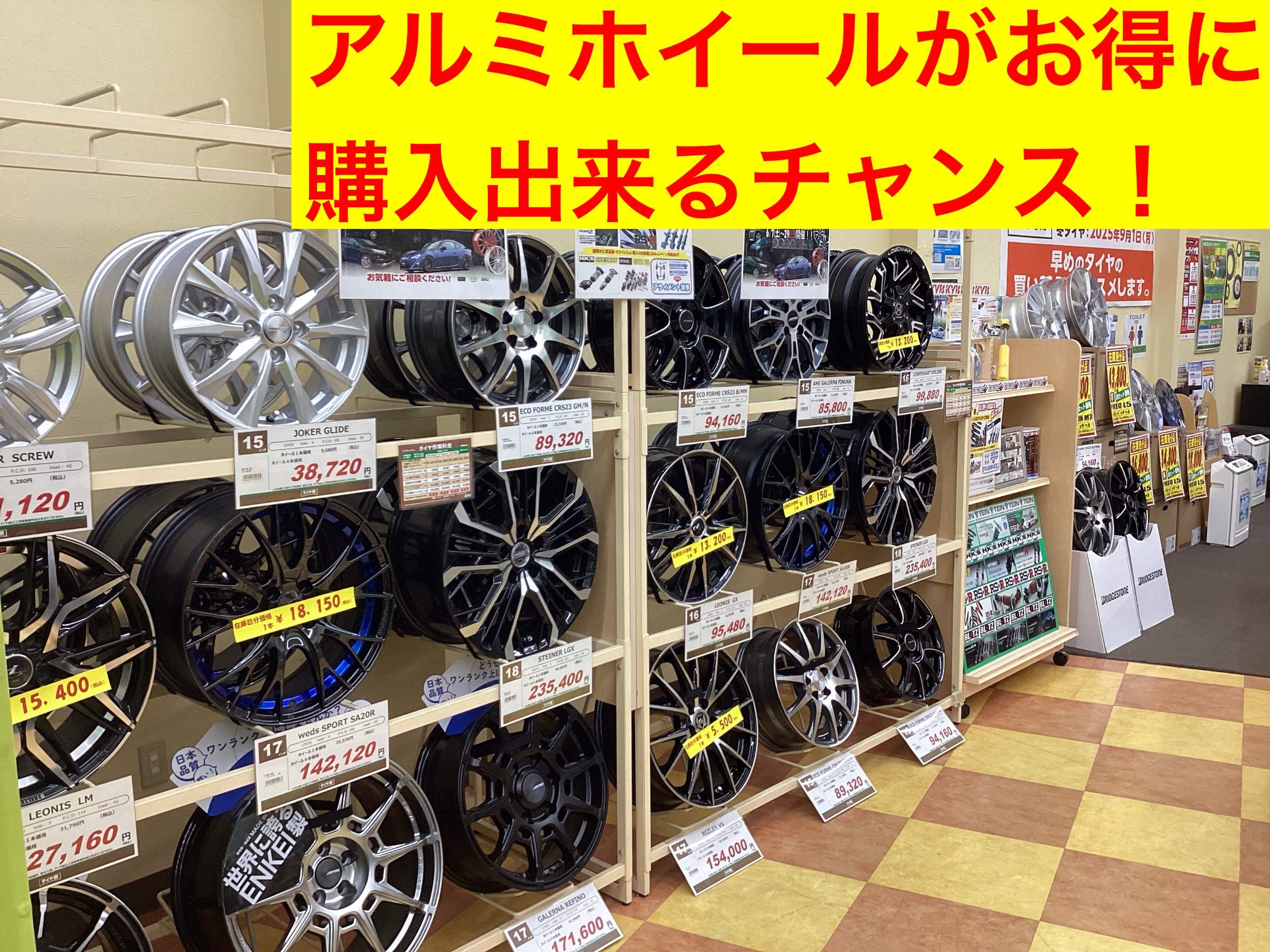 アルミホイール在庫処分品ございます!! 2025年6月8日 タイヤ館ひたち多賀のHPをご覧いただきありがとうございます! 当店では現在、在庫処分品としてアルミホイールのセールを行なって います! アルミホイールがお得に購入出来るチャンスです! サイズが合えばラッキー! 当店の在庫で下の5種類ございます! 皆様のご来店お待ちしております!
