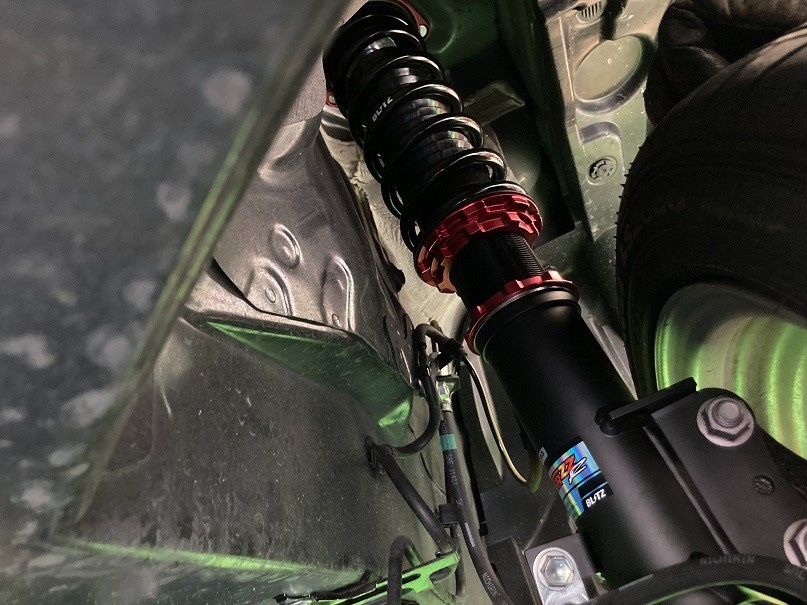 リアを完全に下げきった状態で、フロントのフェンダーの隙間と全体のバランスを見てフロントの車高を合わせました。