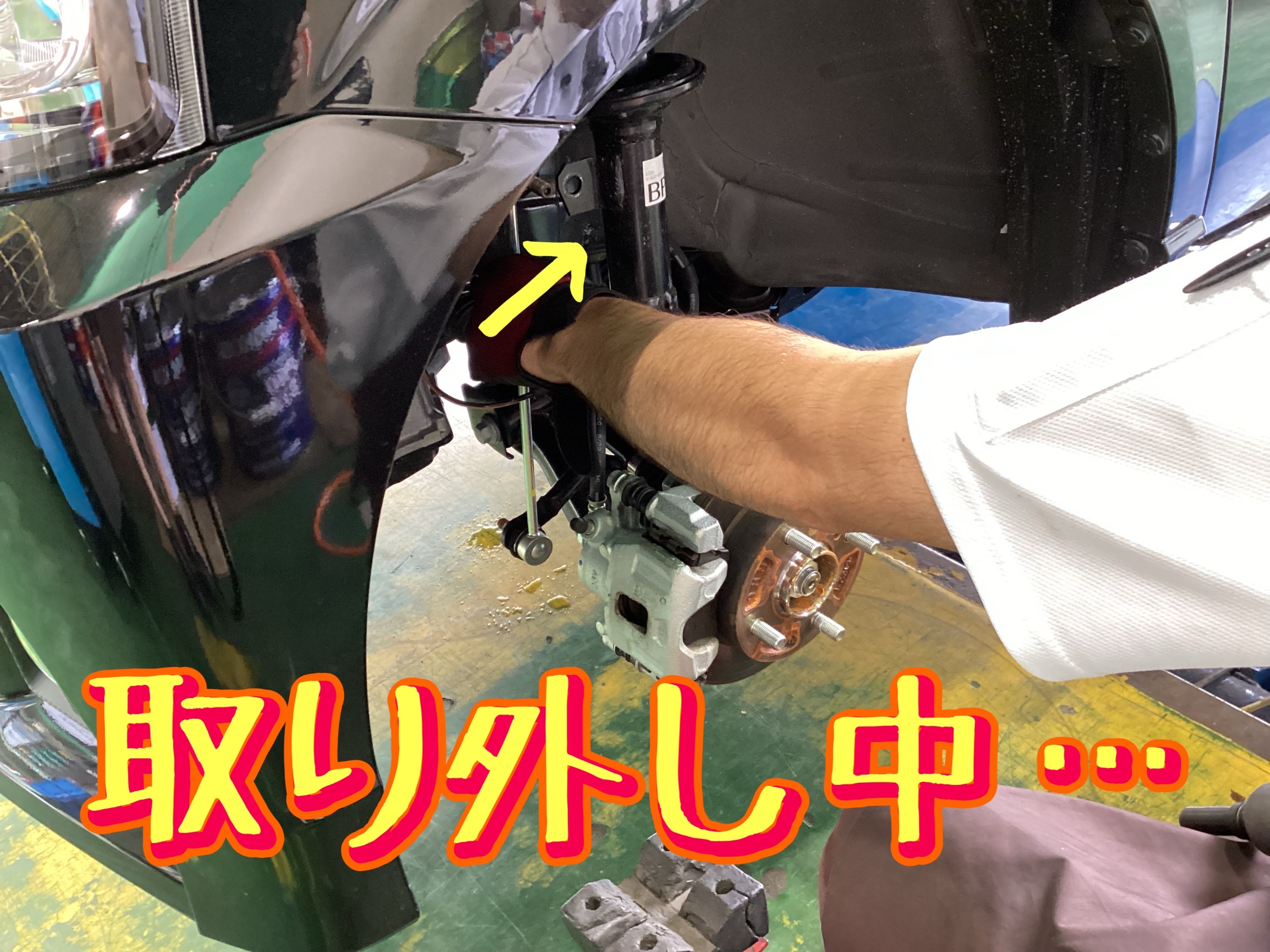 タイヤを外し、純正のショック類を外していきます!