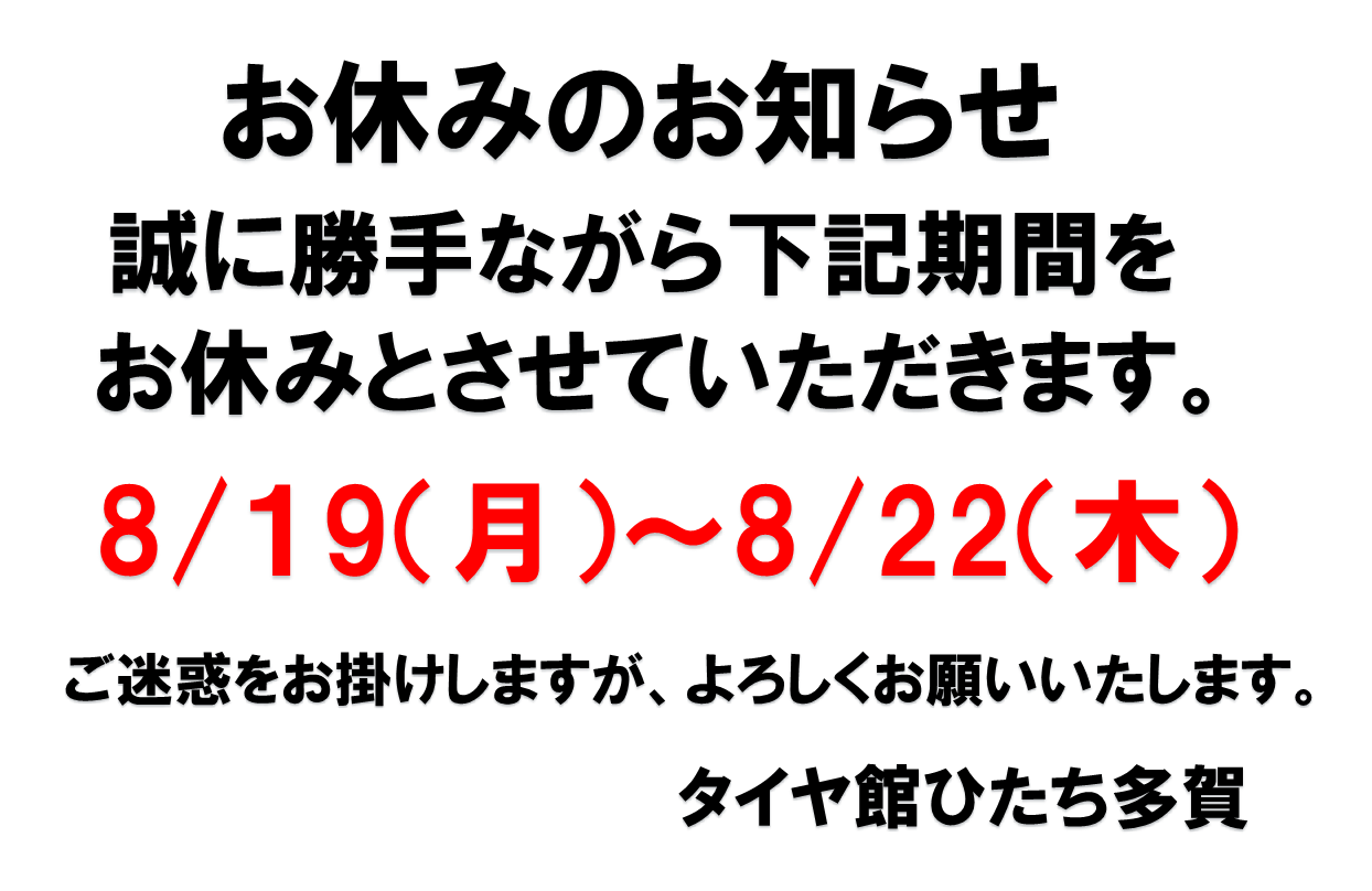8月19日(月)~22日(木)は休業となります。 ポスト 2024年8月16日 タイヤ館ひたち多賀のwebをご覧いただきありがとうございます。 下記にある通り19〜22までお休みを頂きます。 ご迷惑をおかけ致しますがご理解ご協力の程 よろしくお願い致します。 カテゴリ:お知らせ