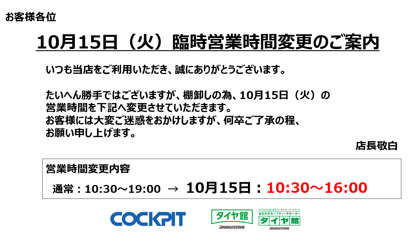 10月15日、棚卸しの為、営業時間が変更になります。
