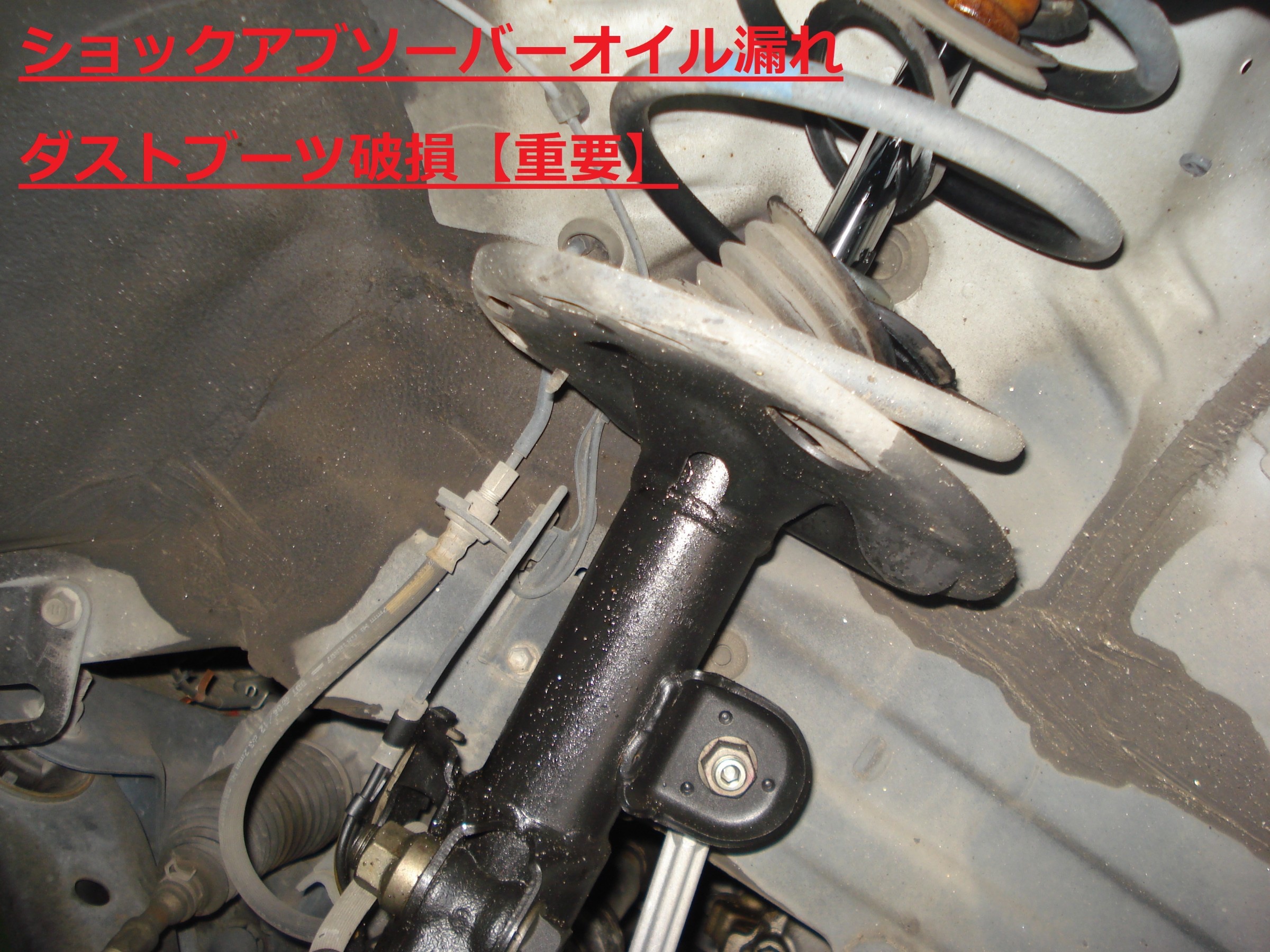 ボロボロになったダストブーツの切れ端が、何かのきっかけでショックアブソーバーのロッド部分に噛み込んでしまい、ショックアブソーバーがストロークした際にオイルシールを破損。