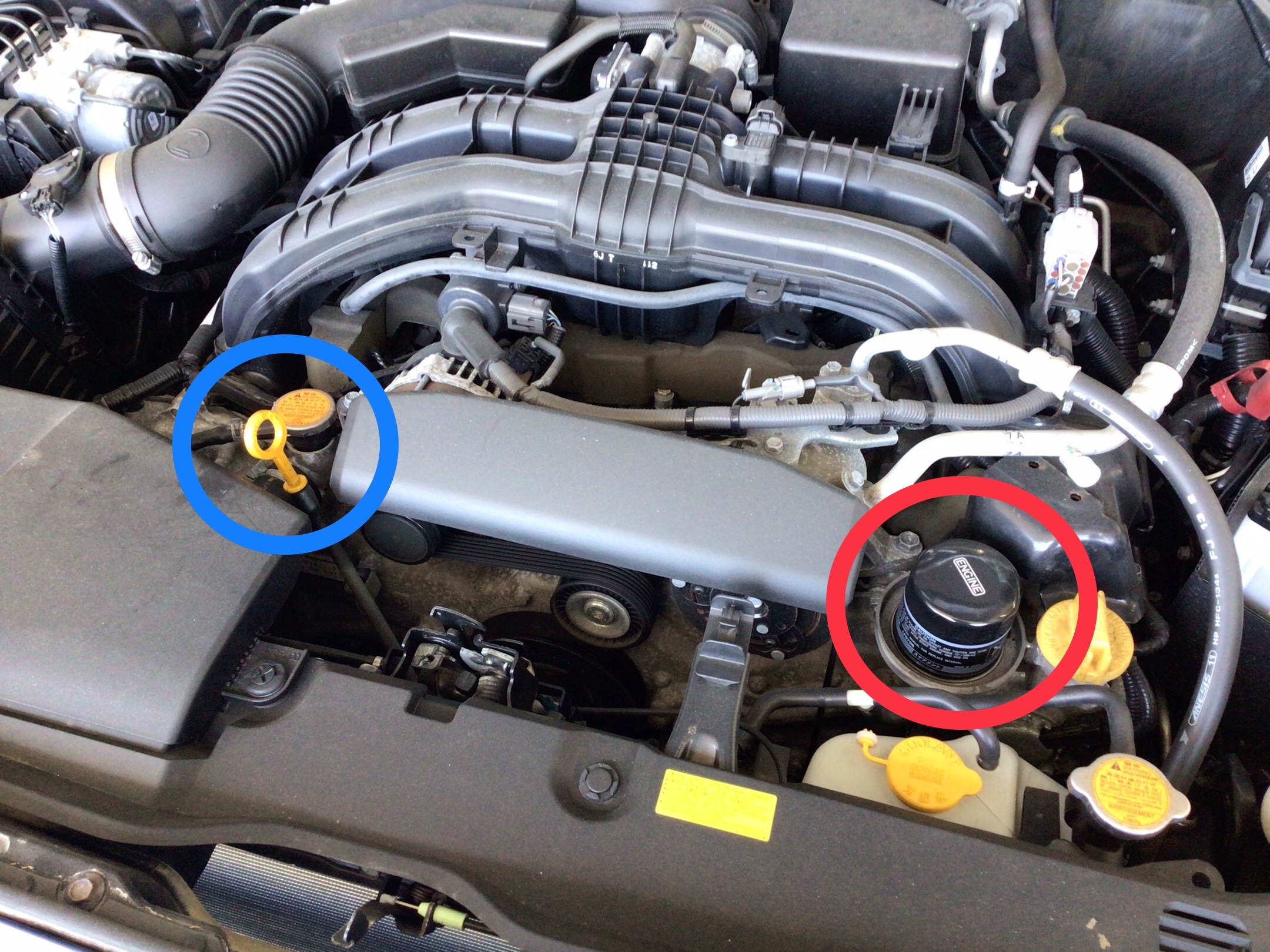 赤丸がオイルエレメントで、青丸がオイルのレベルゲージに