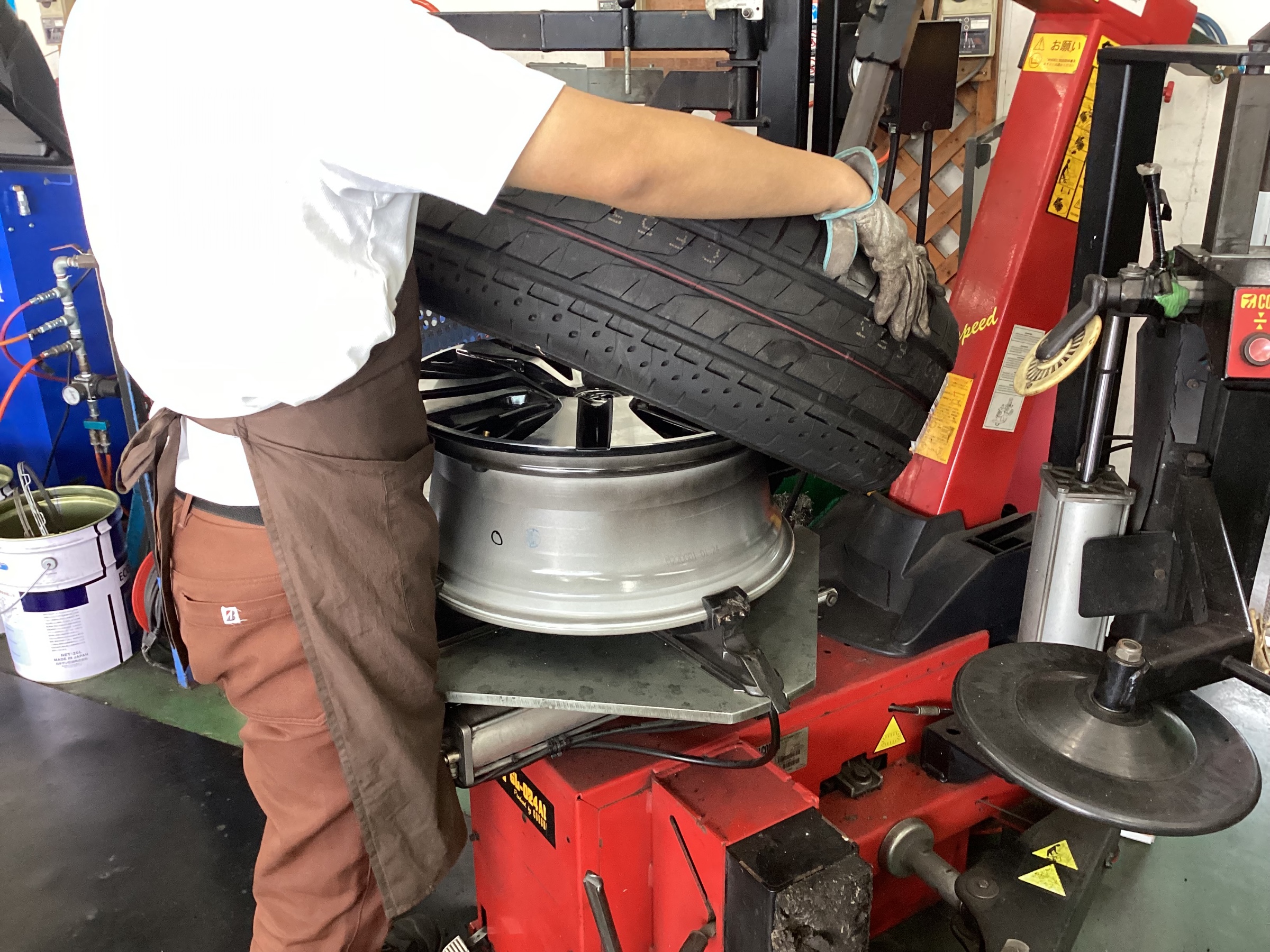 バルブを新品に交換したら、新しいタイヤに交換していきます。