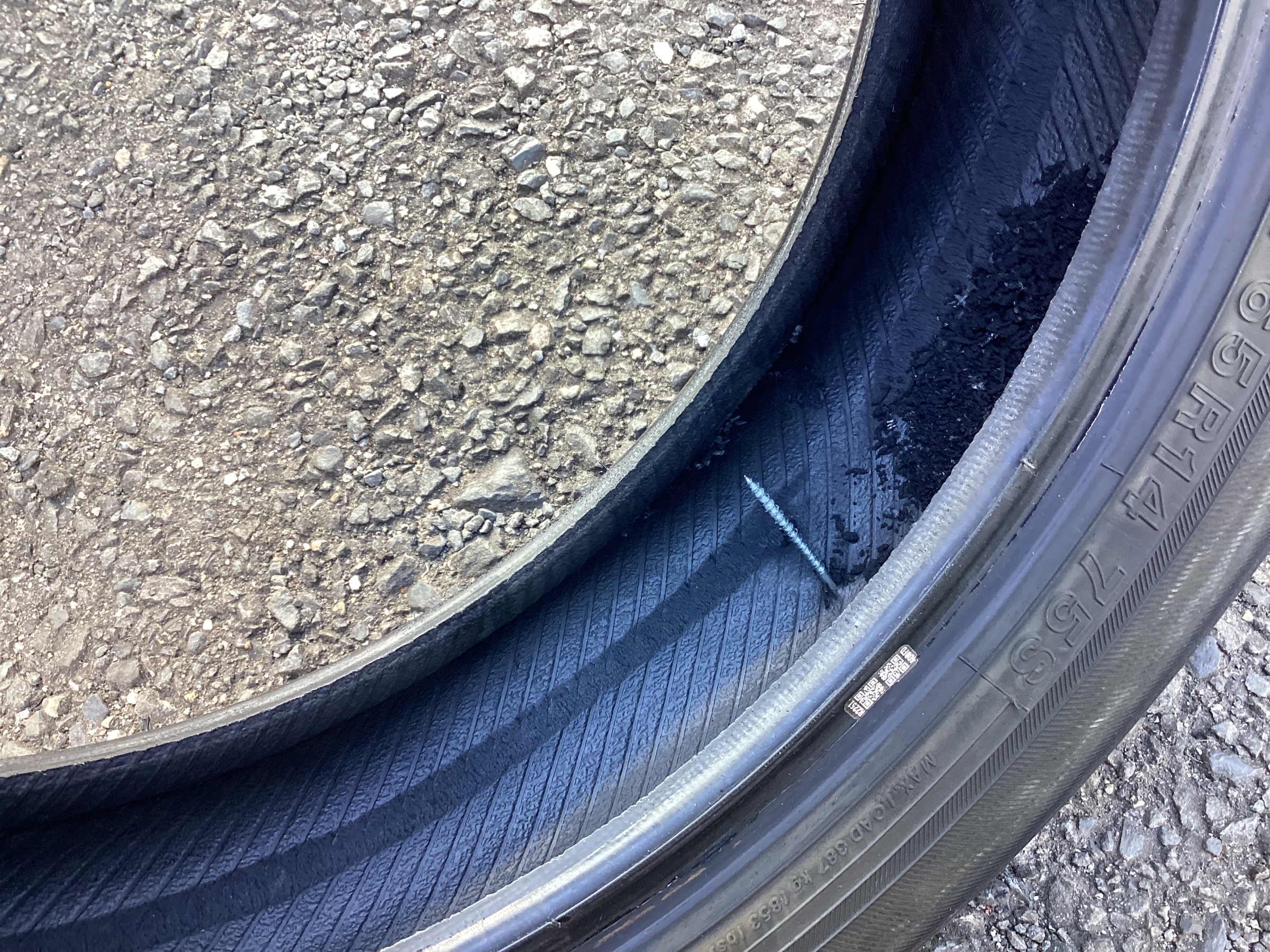 かなり長い釘ですね。貫通してタイヤの側面に達していて危険な状態でした。