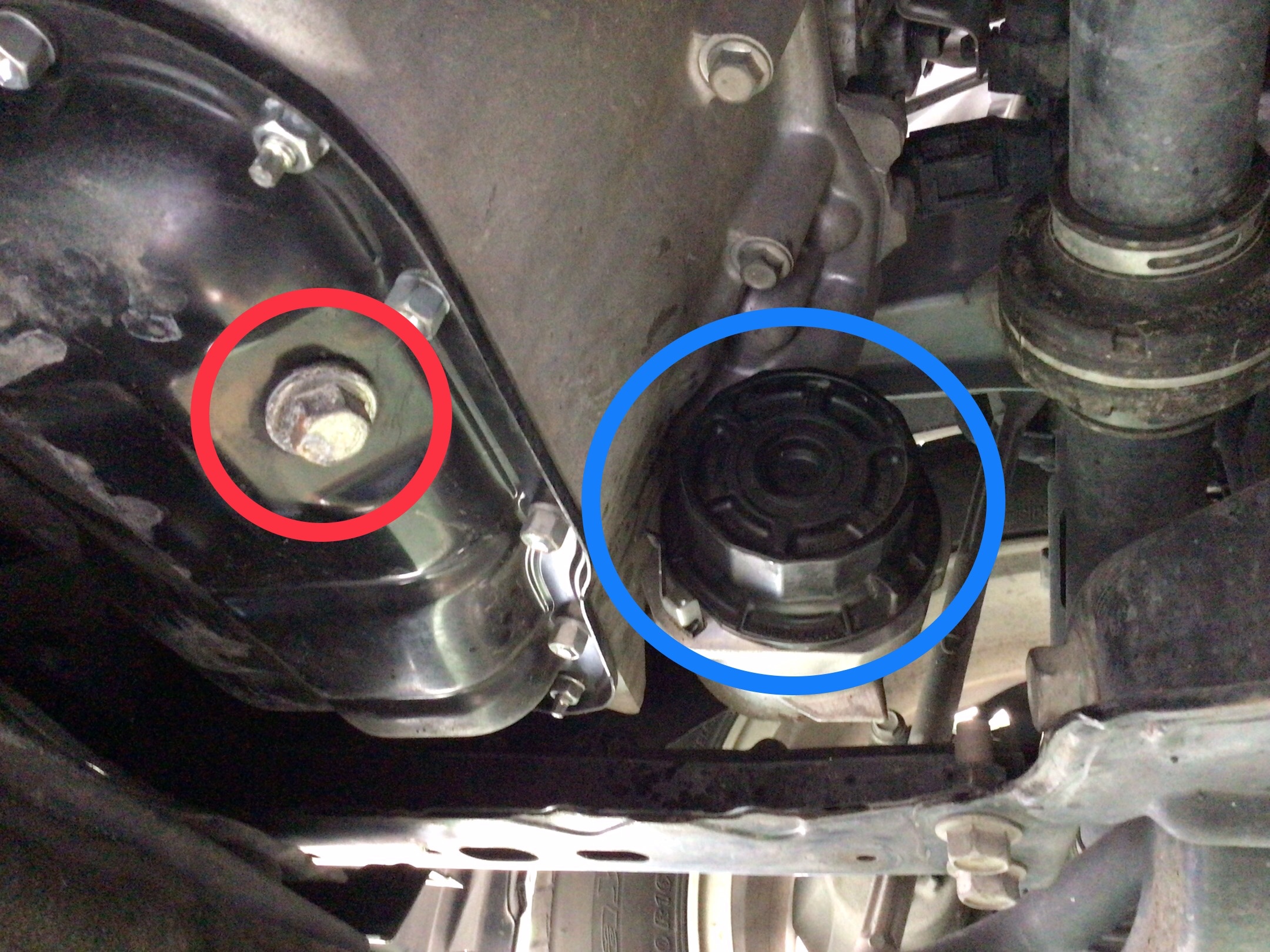 赤丸がドレンボルト、青丸がオイルエレメントになります。