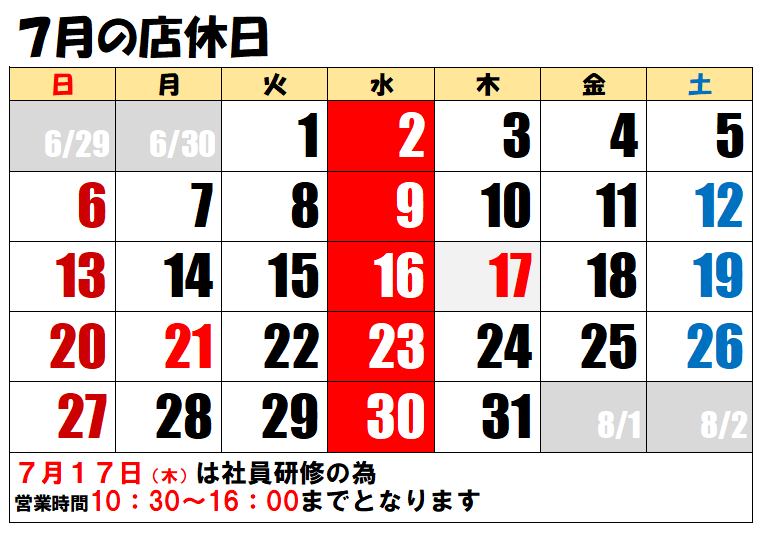 7/17(木)は社員研修の為、営業時間が変更になります。