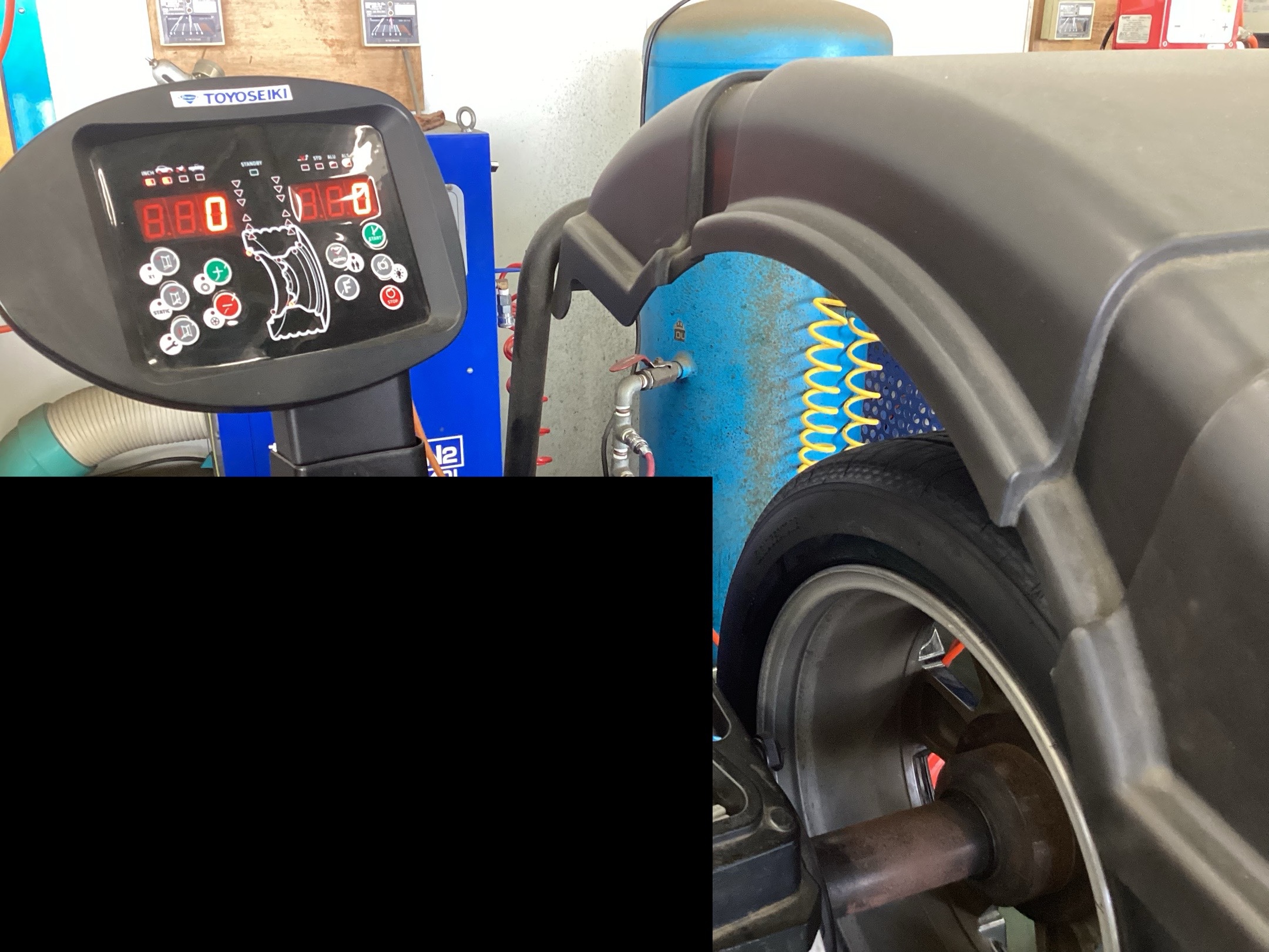 空気圧充填後にバランス調整を行い、車体に取り付けていきます。