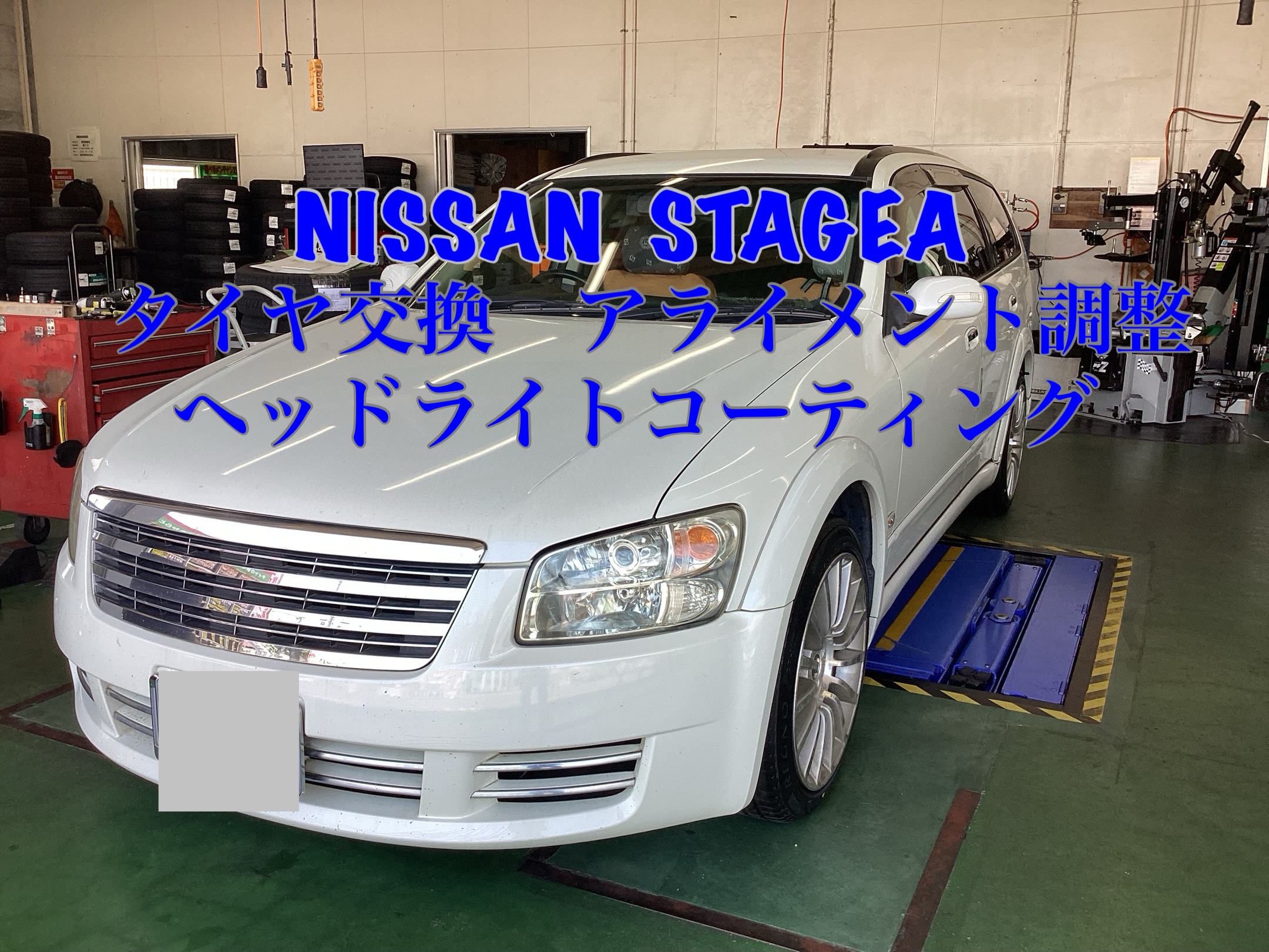 日産・ステージア タイヤ交換 アライメント調整 ヘッドライトコーティング