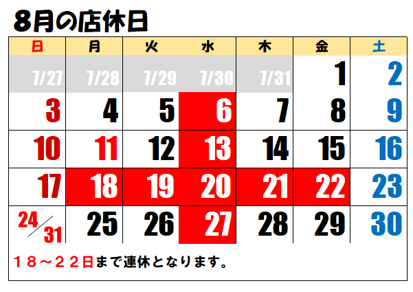 8月の18・19・20・21・22日がお休みになります。