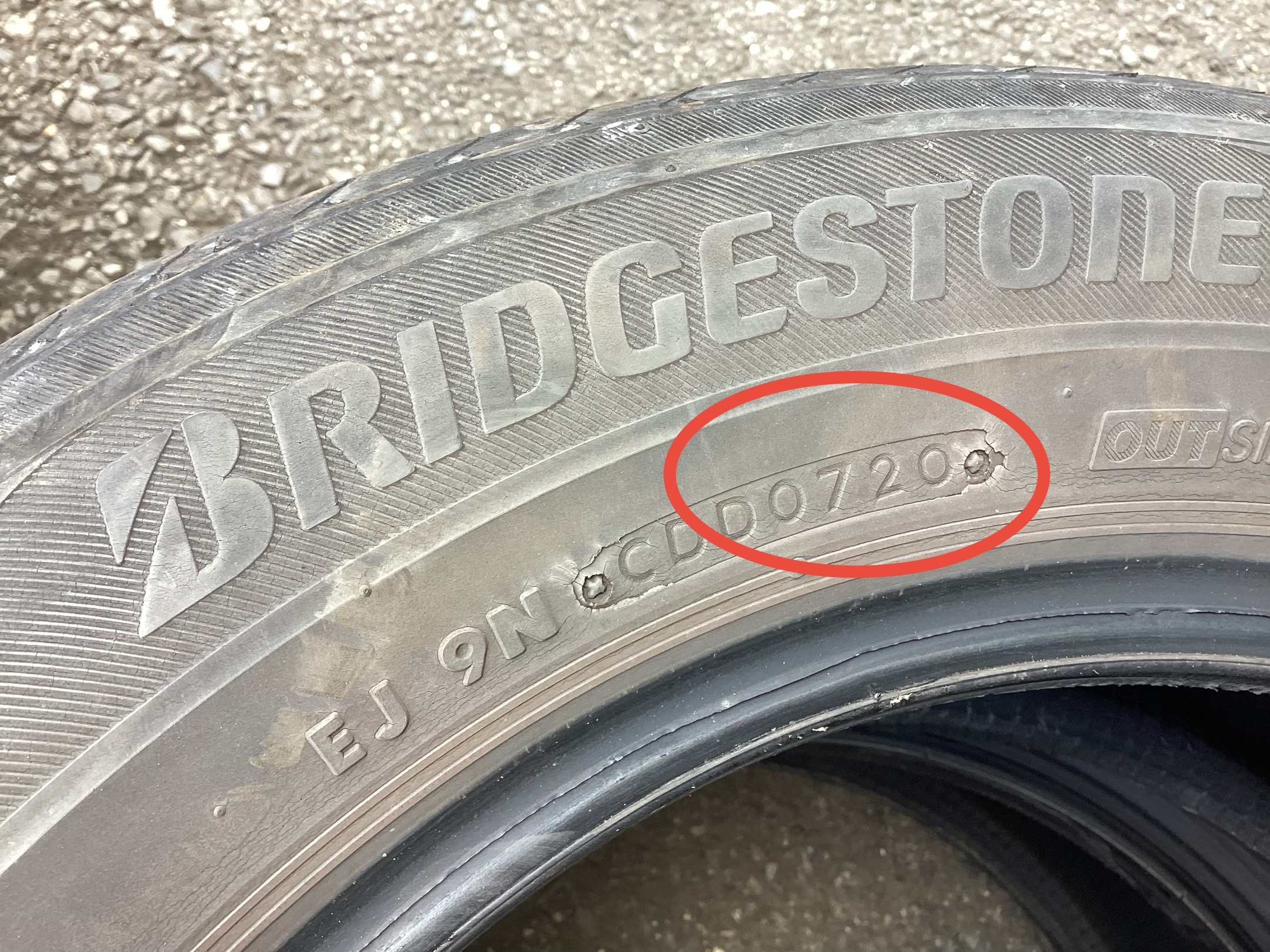 赤丸で囲っている箇所で2020年の7週に製造されたタイヤに