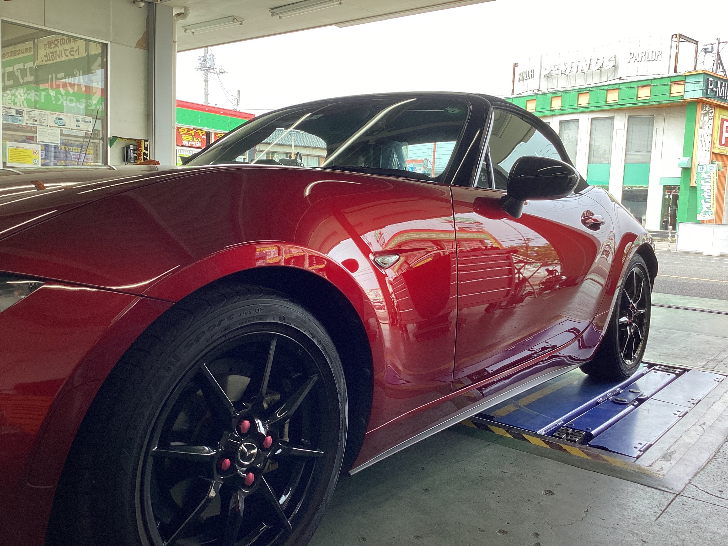 今回はマツダ・ロードスターに車高調のお取り付け作業とアライメント調整を行いました。