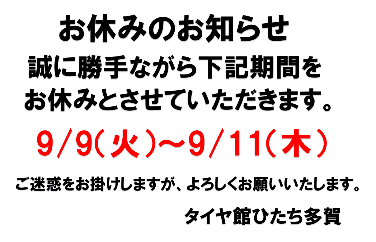 9/9(火)〜9/11(木)はお休みとなります。