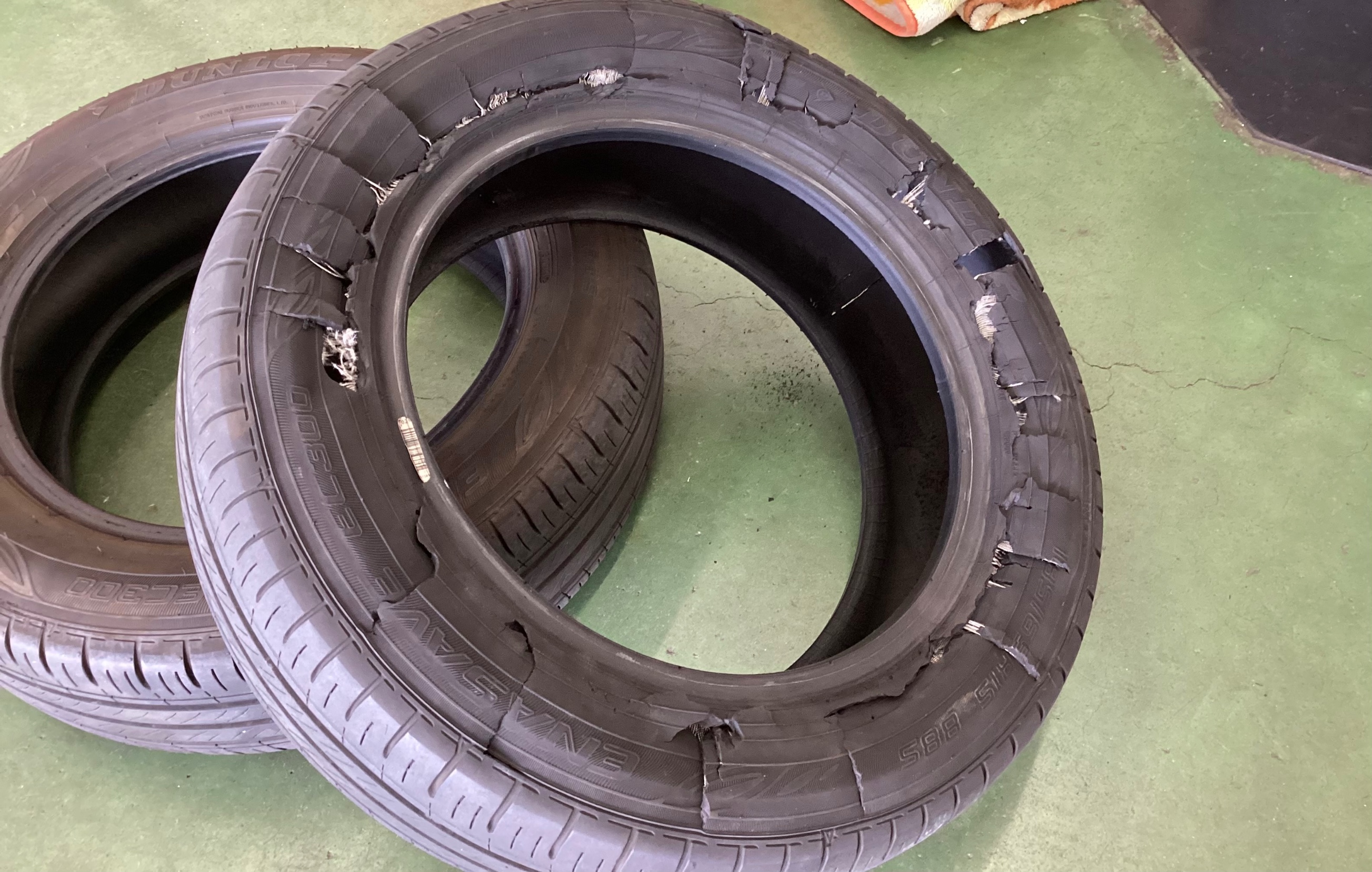 タイヤを縁石にぶつけて、バーストしています。