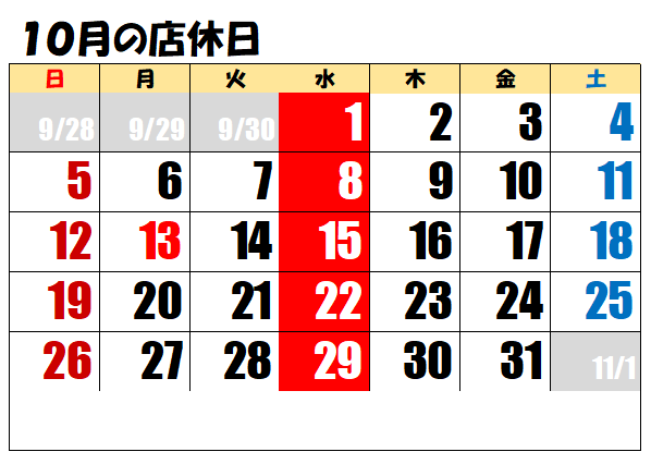 10月の定休日は1・8・15・22・29日になります。