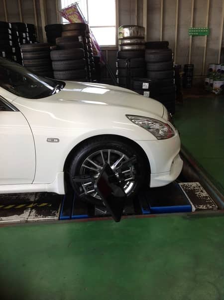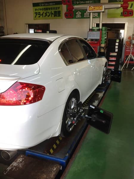 今回のスカイラインは今までアライメントを行ったことがなく、前回装着していたタイヤが内減りしていたため、アライメント作業を行いました!!!